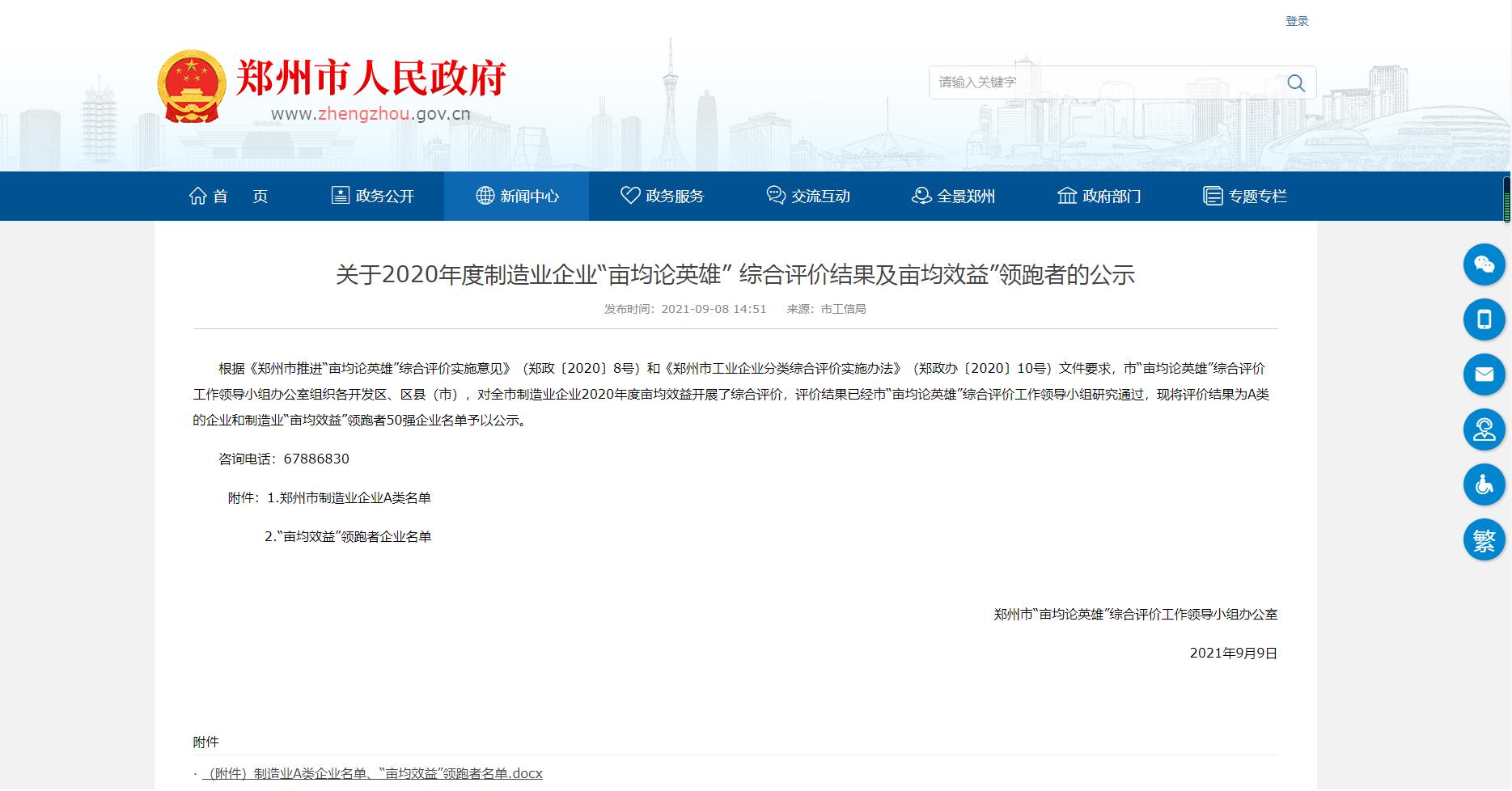 8、2021年9月,被認(rèn)定為鄭州市“制造業(yè)畝產(chǎn)論英雄”A類(lèi)企業(yè)。